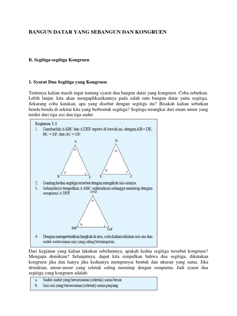 Oleh karena dua bangun dikatakan sebangun apabila sisi sisi yang bersesuaian mempunyai perbandingan yang senilai maka kita dapat menghitung panjang salah satu sisi yang belum diketahui dengan menggunakan konsep perbandingan seperti pada contoh berikut ini. Bangun datar dikatakan kongruen jika memenuhi syarat yaitu memiliki ukuran ukuran sisi yang bersesuaian yang sama dan memiliki ukuran ukuran sudut yang bersesuaian yang sama. Kesebangunan dan kekongruenan bangun datar segitiga dan trapesium hallo sahabat pada bab kali ini kita akan membahas materi yang sering muncul dalam kisi kisi ujian nasional yaitu.