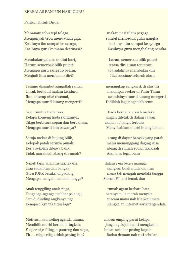 Mulai dari contoh pantun cinta contoh pantun lucu contoh pantun nasehat contoh pantun romantis contoh pantun jenaka contoh pantun agama contoh pantun pendidikan contoh pantun teka teki contoh pantun gombal dll. Contoh pantun berbalas tentang pendidikan yang kedua ini memiliki sedikit perbedaan dari pantun berbalas yang pertama. Jangan lupa untuk belajar besok rabu kita ulangan.