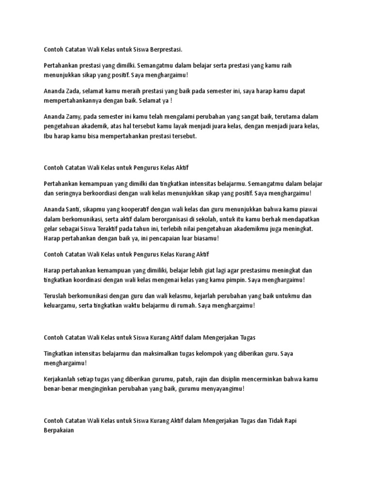 Oleh admin diposting pada 31 agustus 2017 31 agustus 2017. Cataan wali kelas di raport siswa. Contoh catatan wali kelas pada e raport.