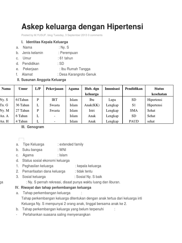 Contoh askep keluarga dengan hipertensi. Pasien datang ke igd pada tanggal 13 januari 2011 jam 1600 wib dengan diantar. Privalensi 6 15 pada orang dewasa 50 diantaranya tidak menyadari sebagai penderita hipertensi sehingga mereka cenderung untuk menjadi hipertensi berat karena tidak menghindari dan tidak mengetahui faktor resikonya dan 90 merupakan hipertensi esensial. Di indonesia banyak penderita hipertensi diperkirakan 15 juta orang tetapi hanya 4 yang merupaka hipertensi terkontrol.