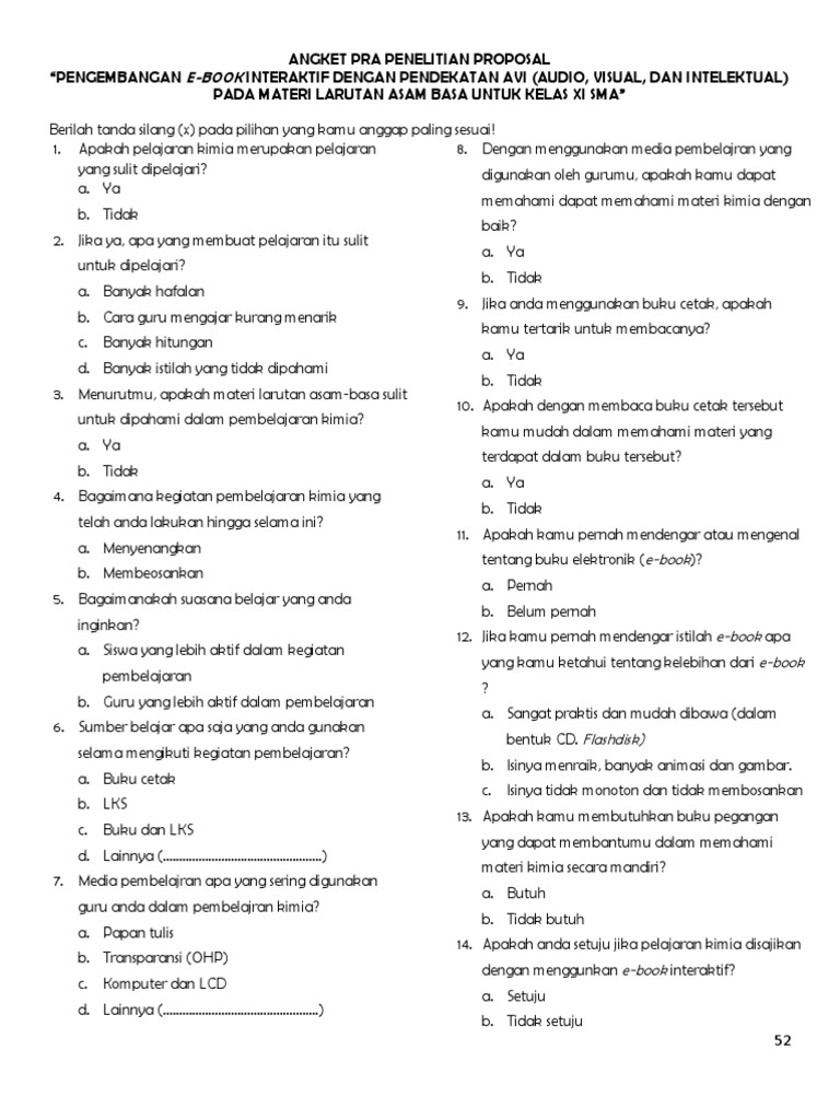 Pada kesempatan ini saya ingin membagikan contoh angket pendapat siswa tentang pembelajaran dalam hal ini berkaitan dengan pembelajaran hidrokarbon. Model pengembangan ini dinamakan penelitian dan pengembangan research and development yaitu proses. Untuk pengajaran bahasa asing media ini tergolong tepat karena bila secara langsung diberikan tanpa media sering terjadi ketidaktepatan yang akurat dalam pengucapan pengulangan dan sebagainya.
