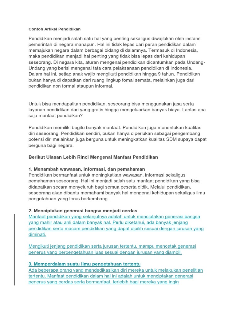 Berbicara tentang pendidikan ini dalam uud pasal 31 ayat 1 dan 2 sudah jelas yaitu bahwa setiap warga negara berhak mendapat pendidikan wajib mengikuti pendidikan dasar dan pemerintah wajib membiayainya negara juga mempriorotaskan anggaran pendidikan sekurang kurangnya 20 persen dari apbn dan apbd. Contoh artikel pengertian artikel berdasarkan kamus besar bahasa indonesia kbbi artikel adalah suatu hasil karya yang berbentuk tulisan yang lengkap seperti esai majalah laporan surat kabar laporan berita dan masih banyak lagi. Artikel pendidikan memiliki ciri ciri diantaranya bahasa di dalamnya mudah dipahami isinya memberikan teladan dan membahas tentang pengajaran.