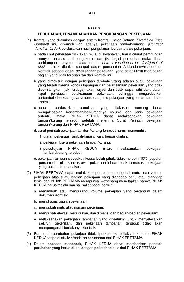 Hal tersebut timbul bisa dikarenakan adanya keperluan perubahan spesifikasi teknis pekerjaan yang disesuaikan dengan kebutuhan lapangan atau yang biasa dinamakan dinamakan cco contract change order. Pasal 14 pekerjaan tambah atau kurang tetap tidak ada perubahan. Contoh isi pasal pekerjaan tambah atau kurang proyek bangunan.