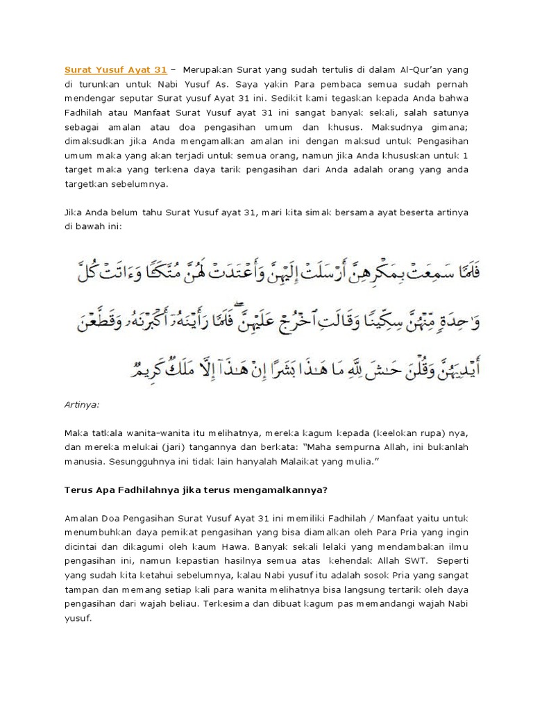 Untuk yang mengamalkan surat yusuf ayat 4 mengaku keampuhannya mengundang rasa cinta kasih pada sesama manusia. Sedikit kami tegaskan kepada anda bahwa fadhilah atau manfaat surat yusuf ayat 31 ini sangat banyak sekali salah satunya sebagai amalan atau doa pengasihan umum dan khusus. Untuk yang mengamalkan surat yusuf ayat 4 mengaku keampuhannya mengundang rasa cinta kasih pada sesama manusia.